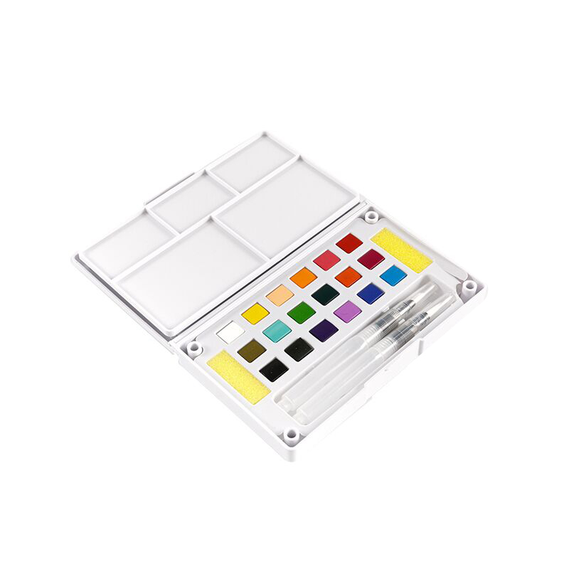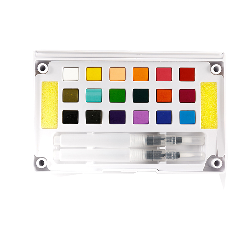 వాటర్ కలర్ ట్రావెల్ కిట్ అనేది పోర్టబుల్, రీఫిల్ చేయగల మరియు ప్రయాణానికి అనుకూలమైన వాటర్ కలర్ పాలెట్. ఇది ఫౌండేషన్ పెన్నులతో వస్తుంది - మీ మోడల్కి రంగును ఖచ్చితంగా అన్వయించటానికి అనుమతించే చక్కటి చిట్కాతో ప్రత్యేకంగా రూపొందించబడిన ఫౌండేషన్ పెన్. కిట్లో 18 వైబ్రెంట్ వాటర్ కలర్ కలర్స్ కూడా ఉన్నాయి.